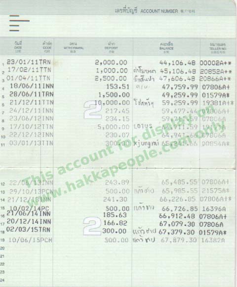 หมายเหตุ---เอ้า? ตอนนี้เราก็มีกองทุนส่วนกลางที่จะเริ่มทำหนังสือแบบเรียนฮากกาศึกษาหรือดิกชันนารีแล้ว บัญชีส่วนกลาง ของชุมชนก็มีขึ้นมาแล้ว จึงขอเรียนเชิญไท้ก๋าหยิน หรื่อทุกทุกท่าน ที่มีฐานะการเงินมั่นคง มีเงินเหลือเก็บ ขอช่วยแบ่งมาให้ส่วนกลาง คือกองทุนเริ่มตั้ง ของชุมชนฮากกาของเรา ตามบัญชี ที่อาฉีโก ได้อาศัยฤกษ์ยามงามดี ในวันพืชมงคลปีนี้ ปลูกต้นกล้าของเราขึ้นมาแล้ว เท่าที่ไหงทราบ (ขออนุญาตเผยแพร่) เว็ปมาสเตอร์ หรือ อาฉีโก ได้ส่งเงินสำรองส่วนตัว ให้กับทางคณะจัดทำ คือหนูต้นกล้า ไป 15,000 บาท เพื่อดำเนินการในเบื้องต้นแล้ว และน้องเขา ยังมีภาระ ที่จะต้องเรียนภาษาจีนกลางขั้นสูงอีก 27,000 บาท ในวันนี้ อาฉีโก ก็ได้เปิดบัญชีโดยลงเงินส่วนตัวลงมาอีก 20,000 บาท เท่ากับว่า ท่านได้เสียสละเงินส่วนตัว เป็นทุนประเดิม ไปแล้ว 35,000 บาท มาครับ มาช่วยกัน คนละไม้คนละมือ เพื่อชุมชนของเรา เพื่อบรรพชนของเรา เพื่อความเป็นปึกแผ่นมั่นคงของชุมชนชาวฮากกาประเทศไทยของเรา