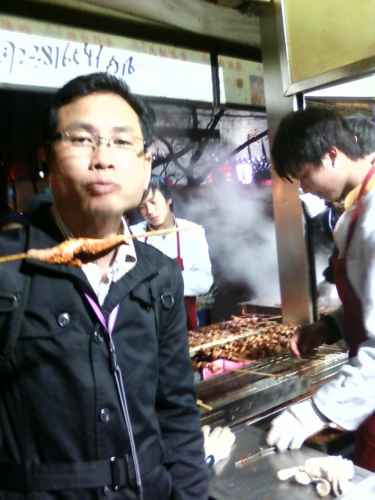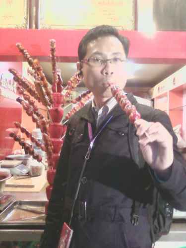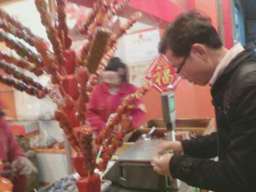 ภาพเหล่านี้กำลังเพลิดเพลินกับอาหารเสียบไม้เป็นบาบีคิวต่าง ๆ คลุกด้วยพริกป่นและหมาล่า แสนอร่อยจริง ๆ เราเดินกินจากต้นทางไปถึงปลายทางทีละไม้สองไม้ แกล้มด้วยพวกเกี้ยวและโรตี ก็อิ่มพอดี ที่เห็นในภาพเป็นผลไม้เคลือบน้ำตาลกรวดจนแข็งเป็นอาหารว่างหรือของหวานของจีนภาคเหนือแถบปักกิ่ง และทางอีสาน ของจีน ก็มี