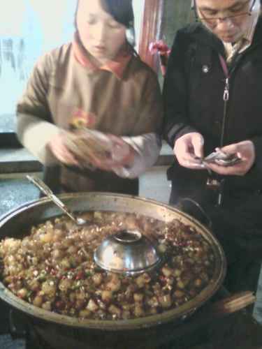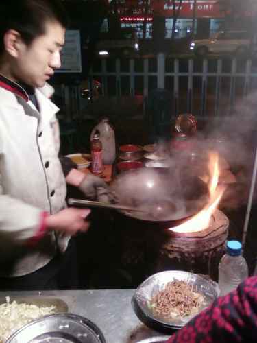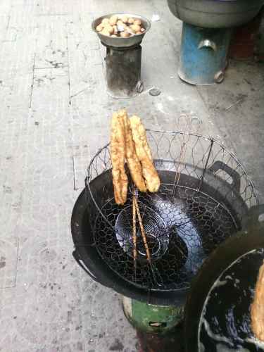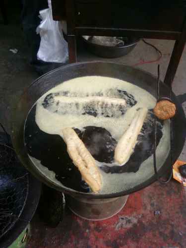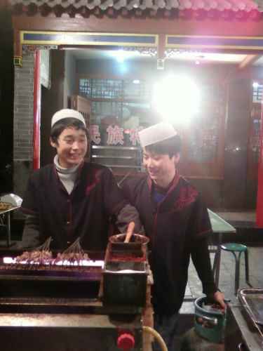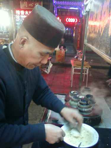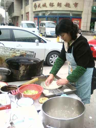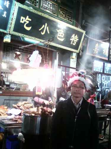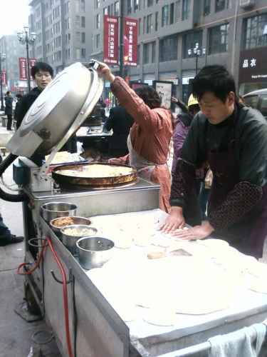 บรรยากาศยามเข้าข้าง ๆ โรงแรมที่พักในนครซีอาน จะมีพวกมุสลิม(เจ้าเก่าอีกแล้วครับท่าน)มาขายพวกโรตี แป้งทอด ต่าง ๆ อร่อยสุด ๆ และมีเจ้าหนึ่งเป็นชาวฮั่น ขายอิ่วจาก๊วย หรือปาท่องโก๋ยาว ๆ ชิ้นเดียวหนึ่งคู่ กินแาล้วอิ่มไปเลย